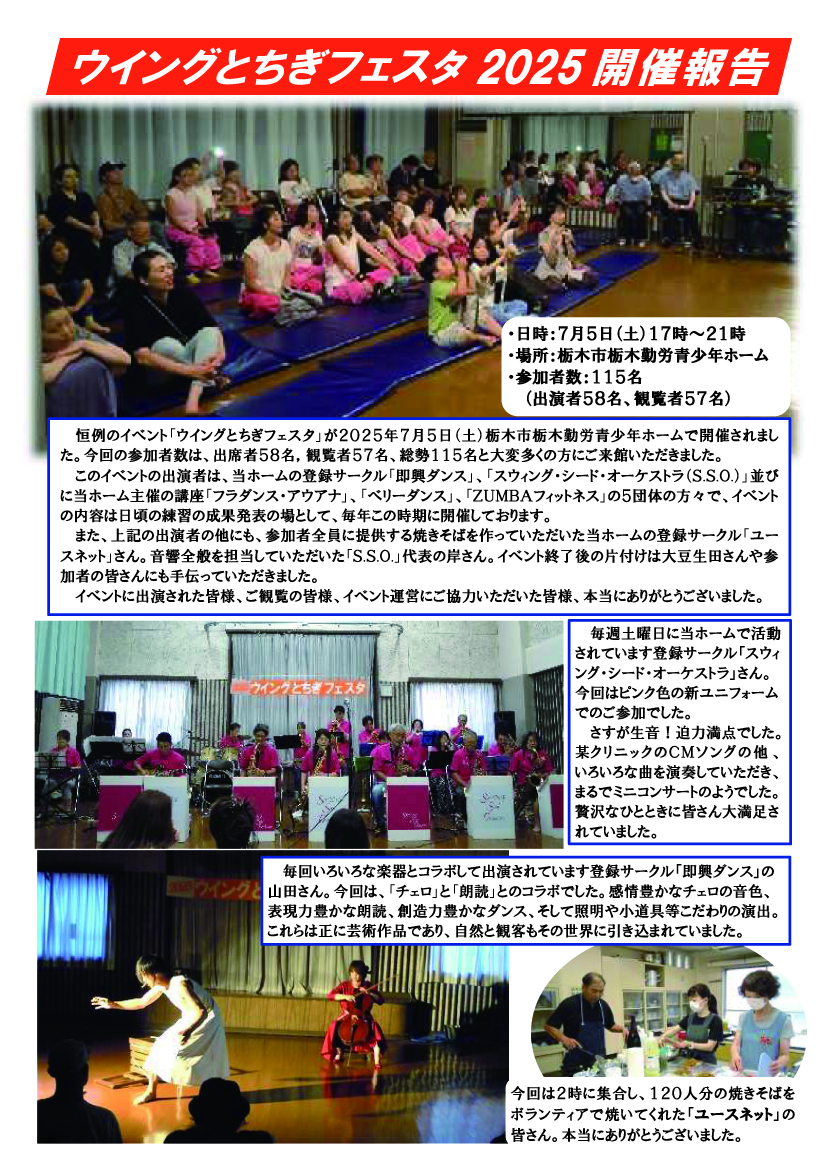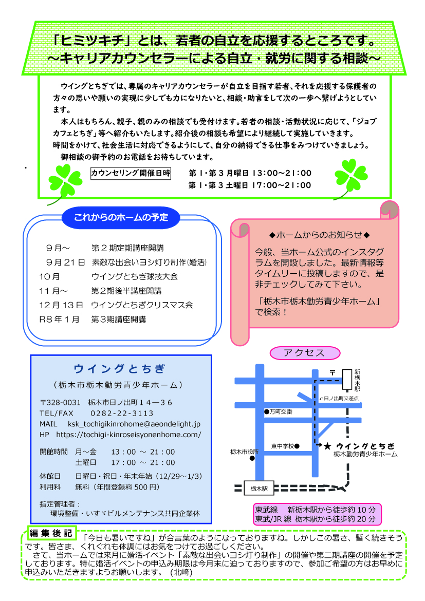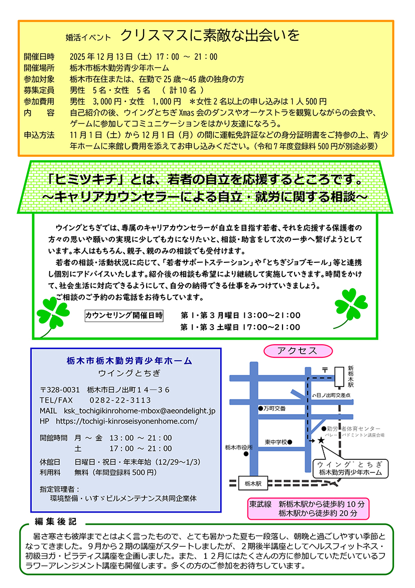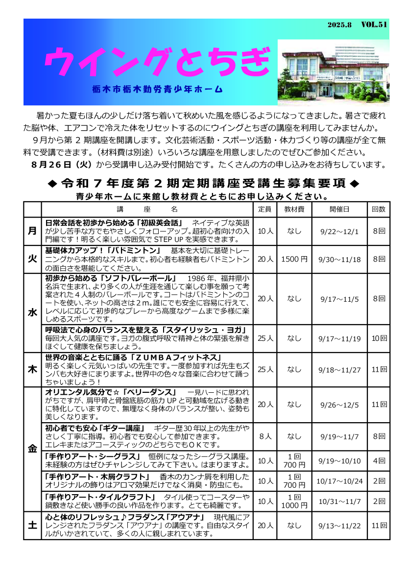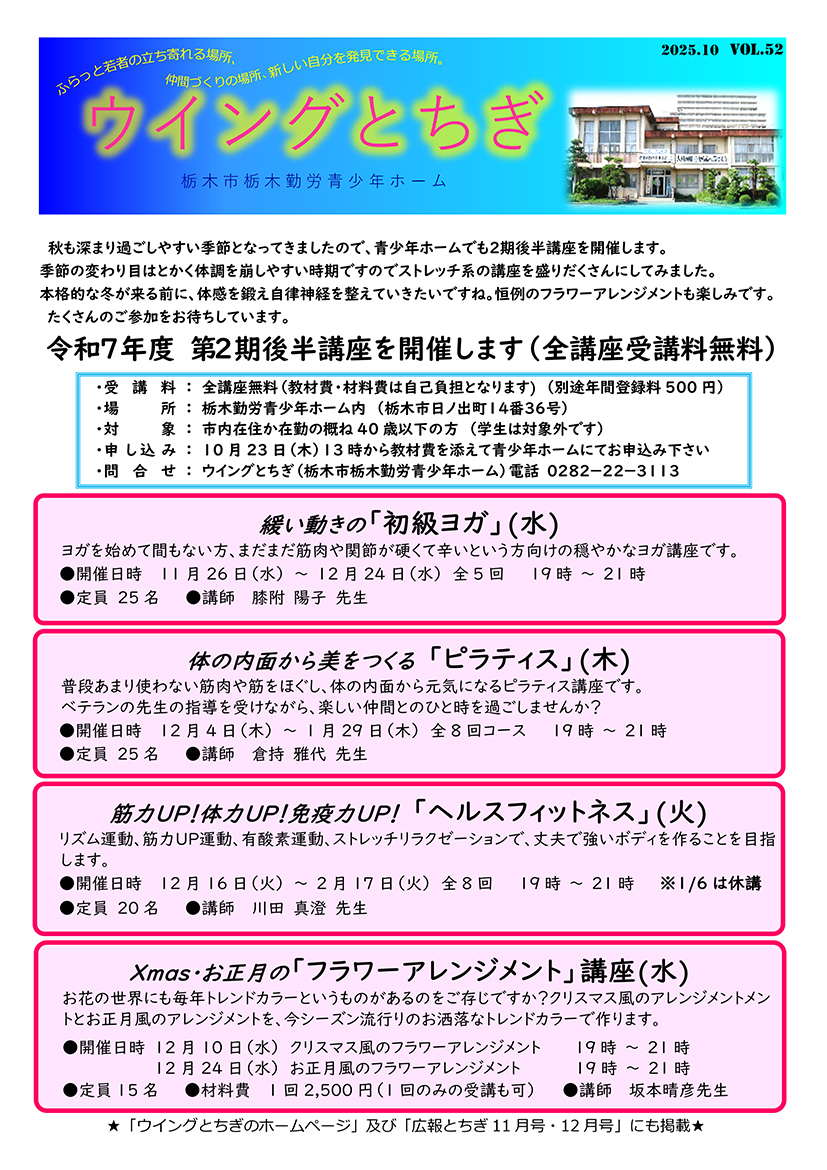 COURSE INTRODUCTION 情報紙【講座紹介】 2025.10.14 ウイングとちぎ(栃木市栃木勤労青少年ホーム)情報紙52号「令和7年度第2期後半講座受講生募集」 2025.8.5 ウイングとちぎ(栃木市栃木勤労青少年ホーム)情報紙51号「令和7年度第2期定期講座受講生募集」